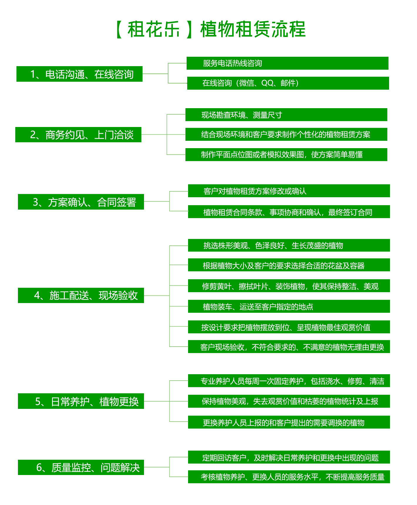 从事植物租赁已20余年,在这过程中不断摸索和总结,形成了一套规范的的植物租赁服务流程,并且在不断的提高、完善该流程,具体的流程查看如下示意图: